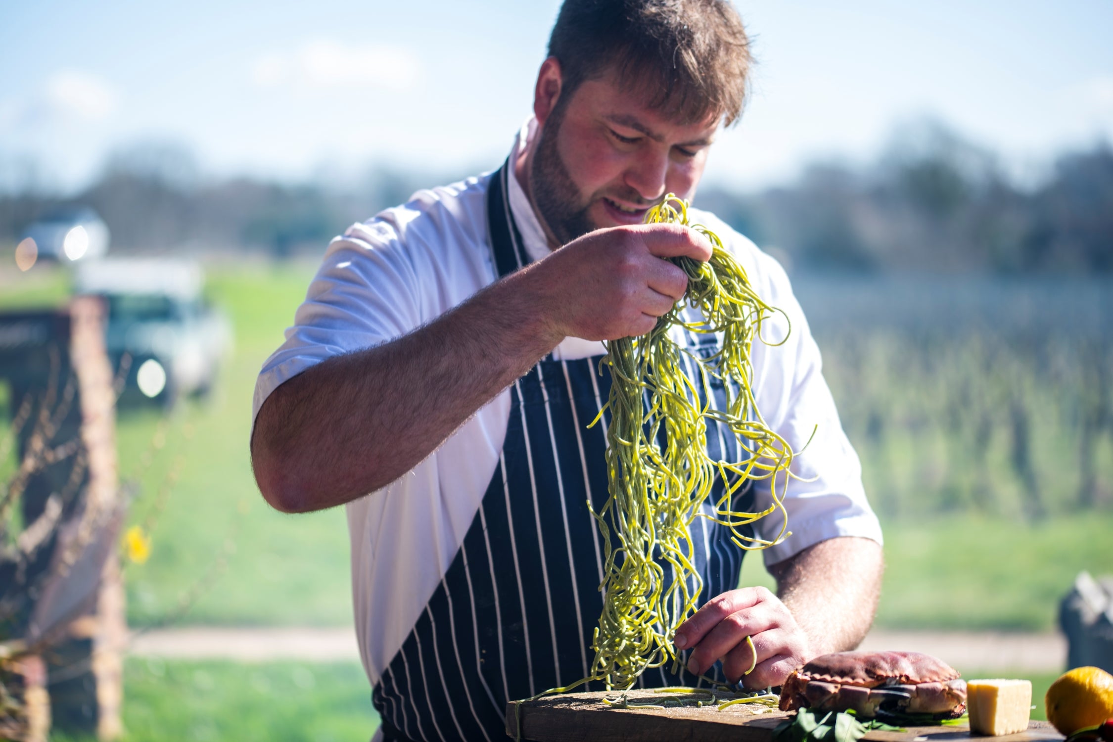 We were blessed with three glorious days for our pop-up this Summer. Over 220 people joined Oliver, Richard and Gregory to dine among the vines and enjoy the very best produce the season had to offer, including tomatoes and melons from the vineyard polytunnel and cherry blossom vinegar with flowers from our orchard. The Harvest Farm Feast in September also featured apples from our own trees for dessert.