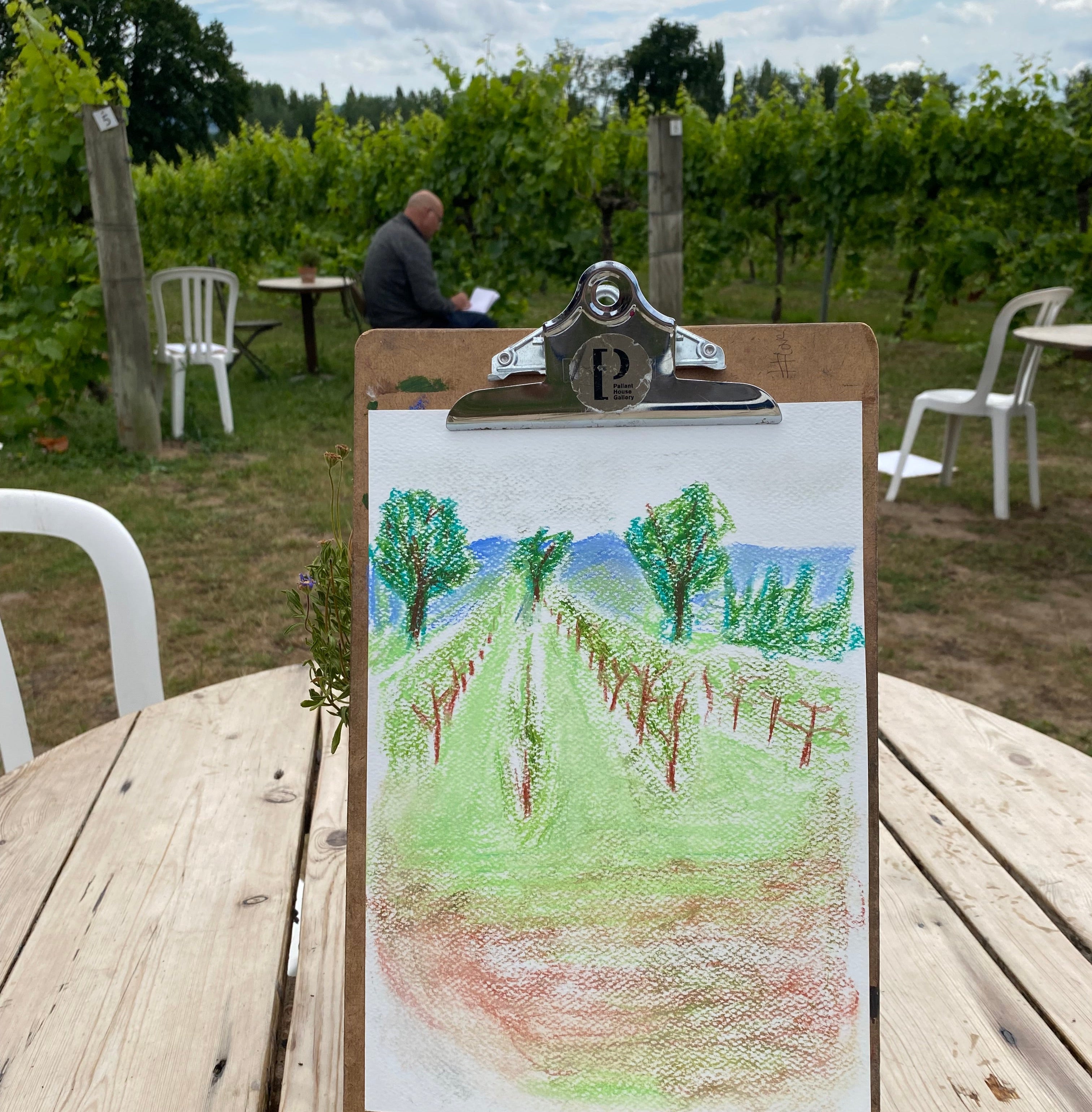 Bridget is a great supporter of a wonderful initiative led by Pallant House Gallery in Chichester called “Partners in Art”. It is a community project to create new opportunities for artistic endeavour and fulfilment. They visit the vineyard each Summer to paint or just relax in the glorious setting.
