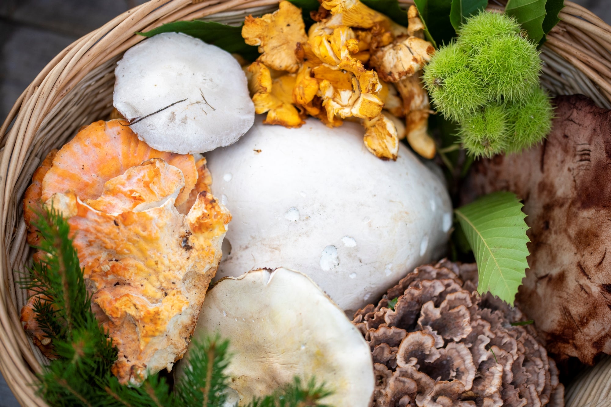 "Deep into the woods, past the acidic ground of the pine trees, up through the unbeaten animal pathways, through the brambles, over the whale shaped fallen oak tree. The rain slows and the sun pushes through the tall branches of the beech trees, the smell of bracken and chestnuts fill the air, now high up on the hill, and there she is - a 2.2 kg cauliflower mushroom. This is something only a dedicated forager could only spot - dark brown and hidden. My senses go electric with excitement, and the smell of this mushroom is as deep as chocolate but as savoury as bubbling brown butter!