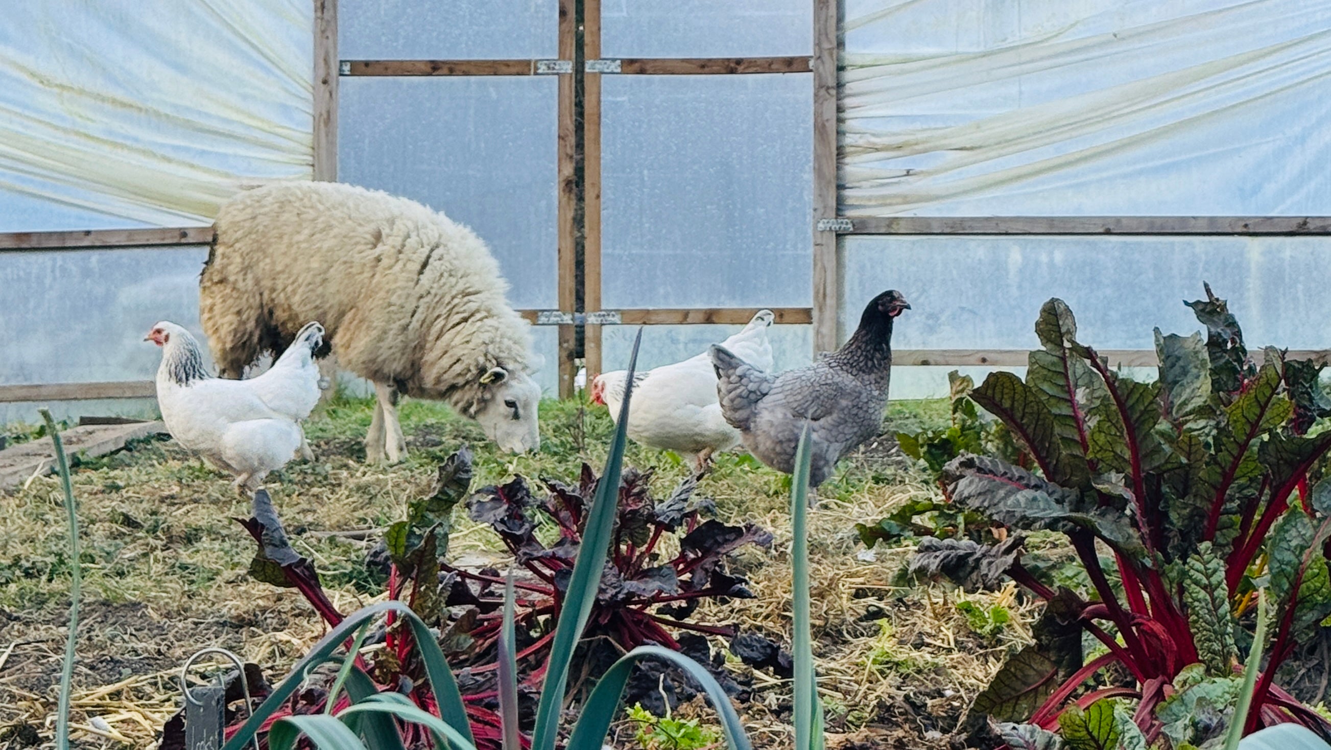 the soil within the polytunnel is required to prepare for the new growing season. A brood of Lani’s chickens have been called in to do the job and to back them up with the heavy lifting; Freddie the sheep has volunteered to lend a hand.