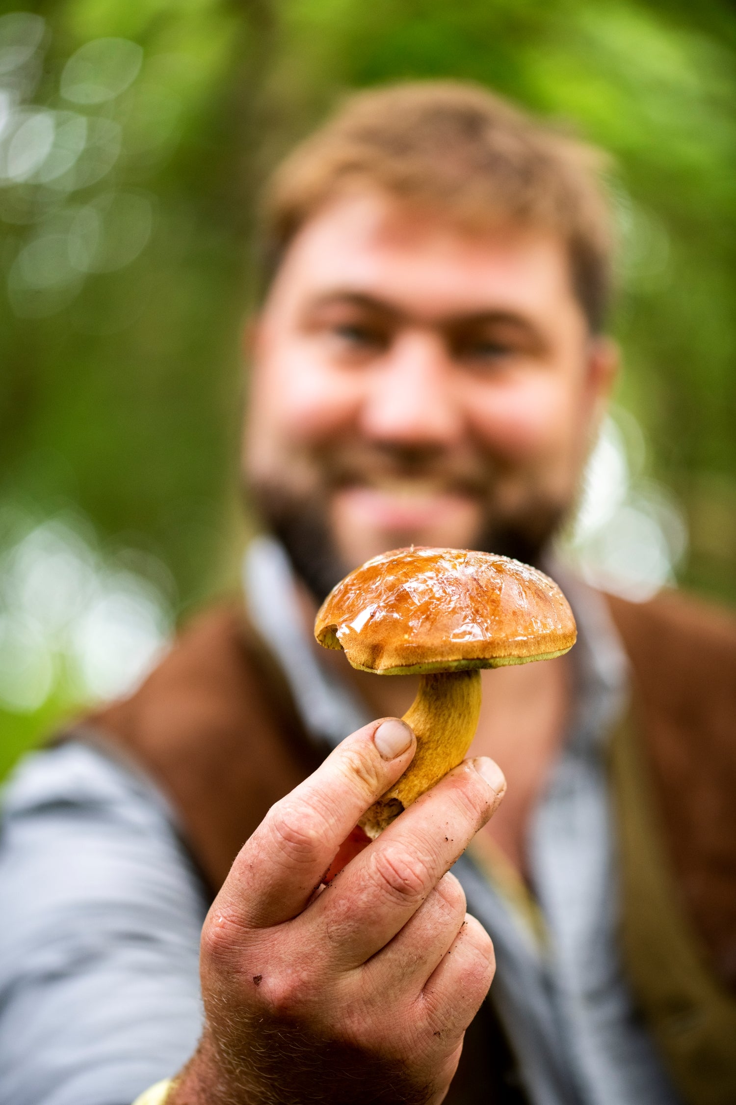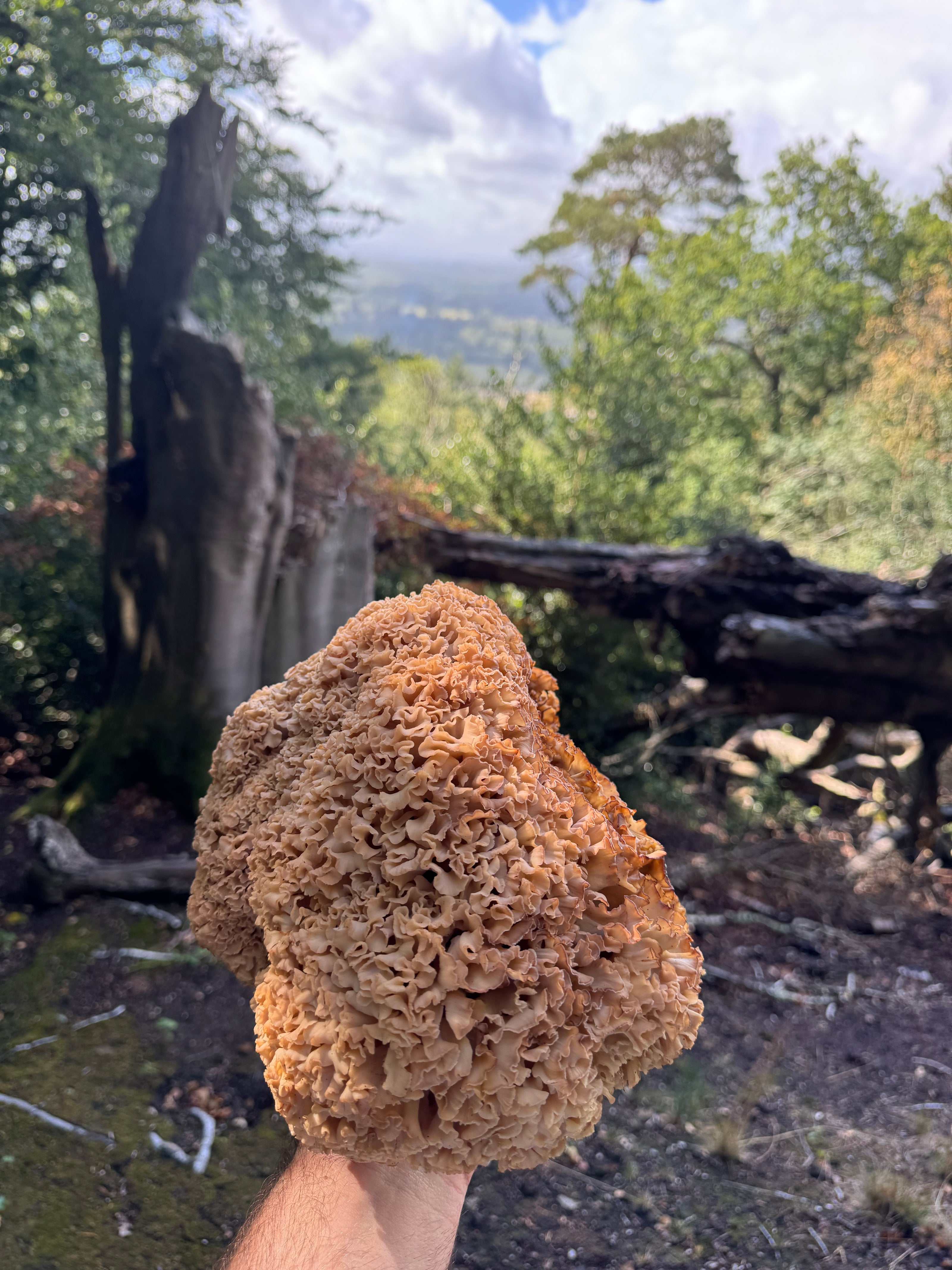 "Deep into the woods, past the acidic ground of the pine trees, up through the unbeaten animal pathways, through the brambles, over the whale shaped fallen oak tree. The rain slows and the sun pushes through the tall branches of the beech trees, the smell of bracken and chestnuts fill the air, now high up on the hill, and there she is - a 2.2 kg cauliflower mushroom. This is something only a dedicated forager could only spot - dark brown and hidden. My senses go electric with excitement, and the smell of this mushroom is as deep as chocolate but as savoury as bubbling brown butter!