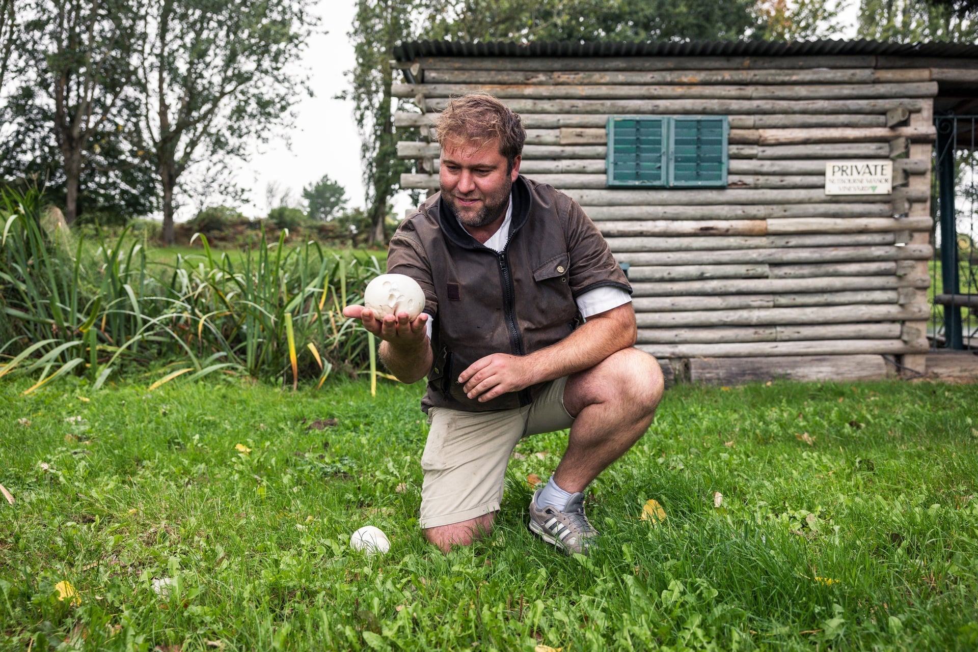 Oliver shows us puffball mushrooms by the lake at Nutbourne →