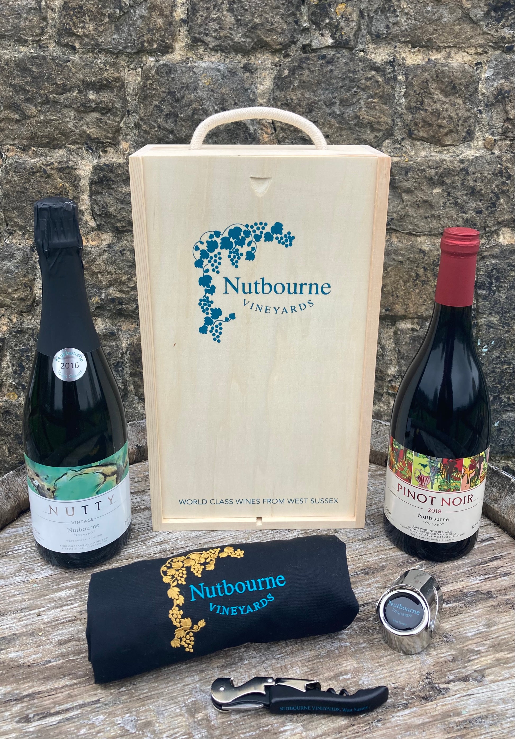 An ideal gift for any wine lover, our Sommelier gift box contains a Nutbourne Vineyards Apron, Sparkling Wine Stopper and Corkscrew, with two of our most popular wines, Nutty Vintage Brut and Pinot Noir. Presented in a Nutbourne Vineyards wooden gift box, with our art cards for each wine - these feature the paintings by Bridget Gladwin and provide tasting notes with pairing suggestions.