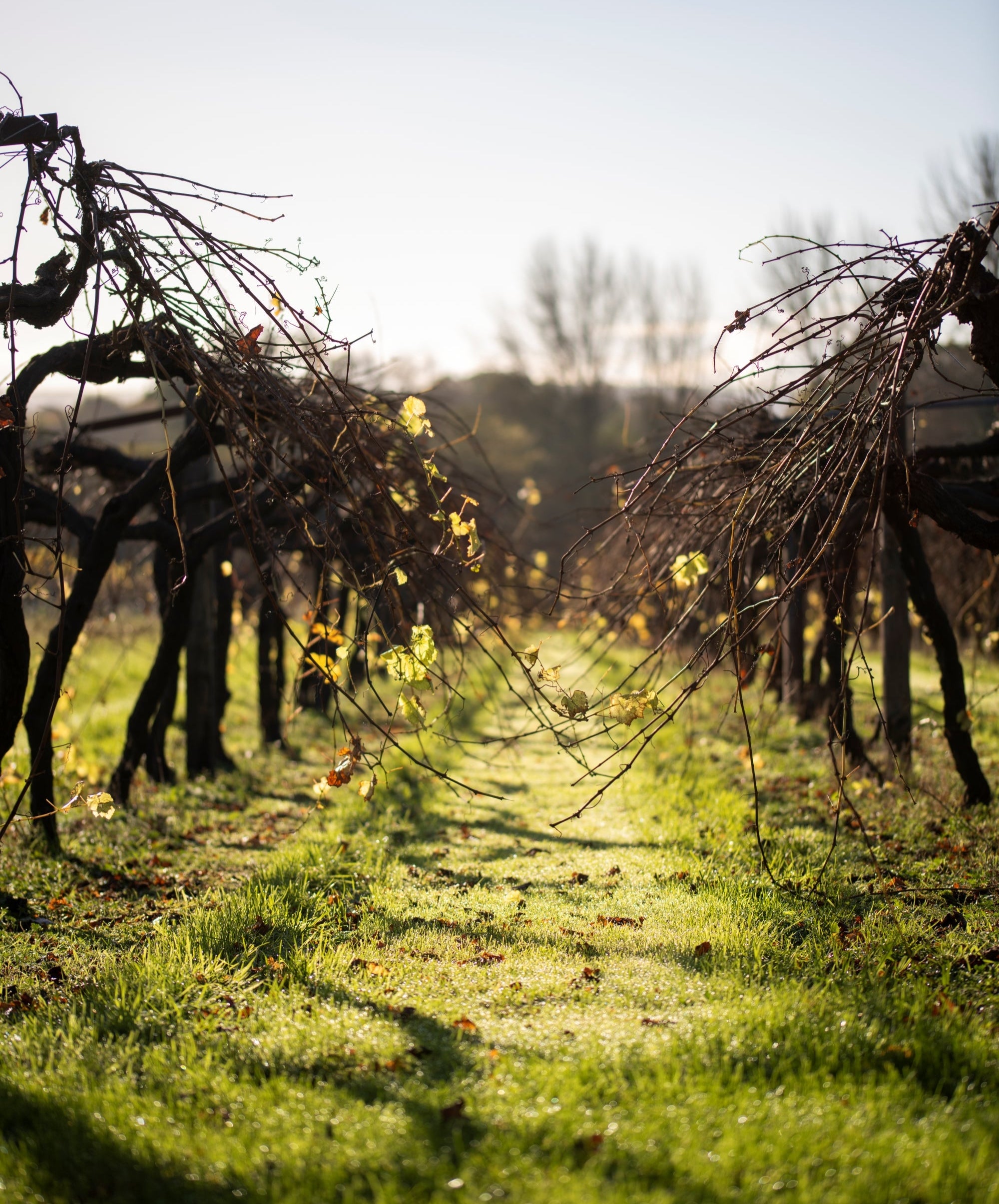 We harvest the rainwater from the roofs of our buildings for spraying and hoses. Irrigation is rarely required for vines in the UK but when needed, this is pumped from the natural watercourse on the estate.